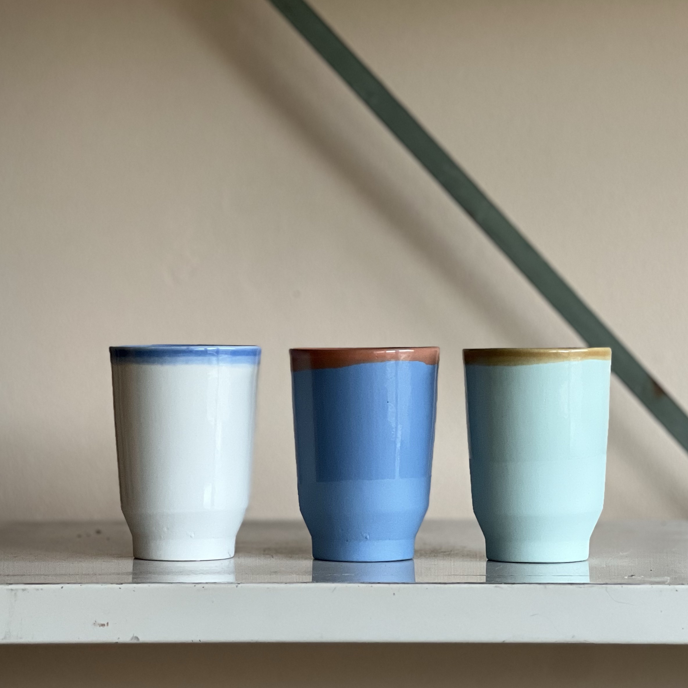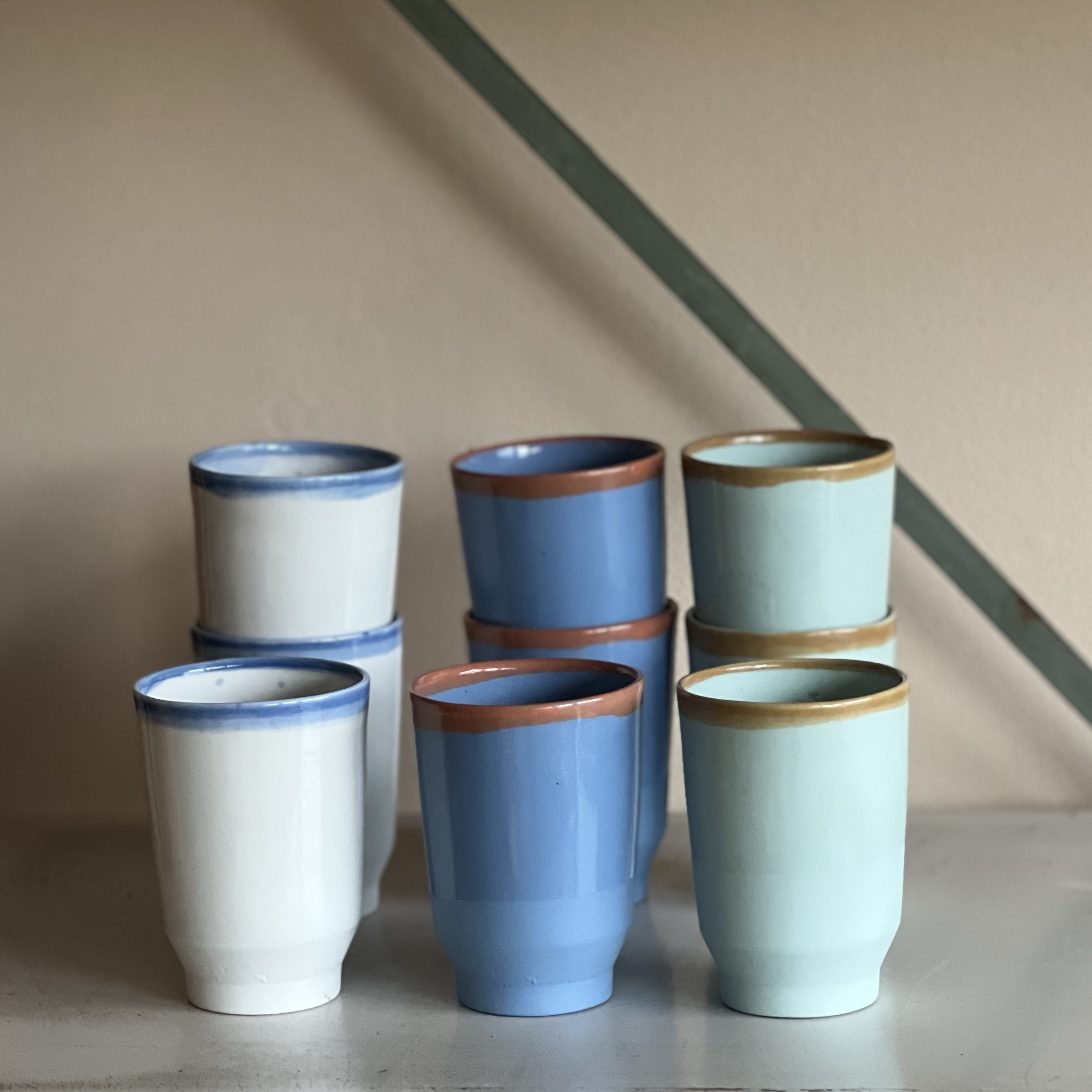 De kopjes zijn gegoten met één kleur gietklei en hebben daarna een contrasterend randje kleur gekregen aan de bovenkant.